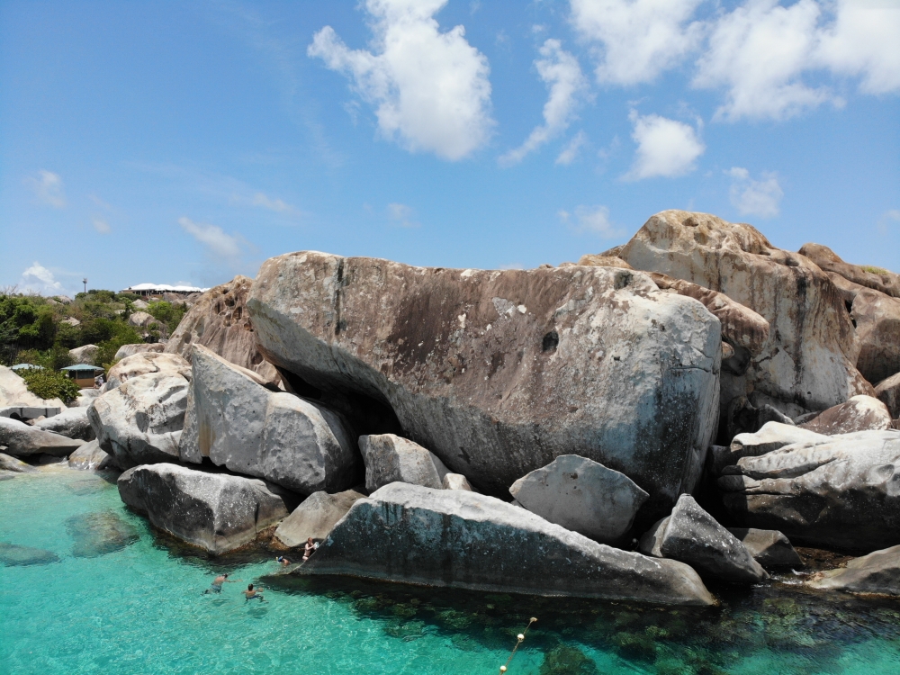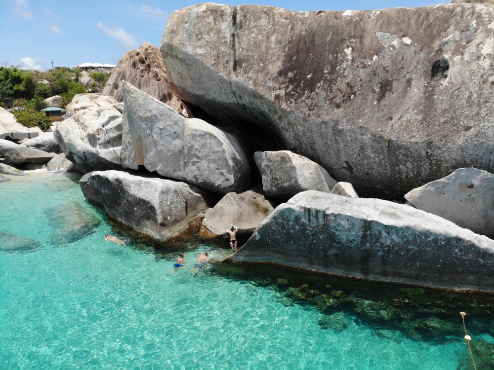 The Baths are a unique natural area on the southwestern end of Virgin Gorda, where giant granite boulders are scattered across the beach and shoreline, forming caves, grottos, and tidal pools that are incredibly fun to explore. These massive rocks rest on a stunning white sand beach with crystal clear water and breathtaking views.